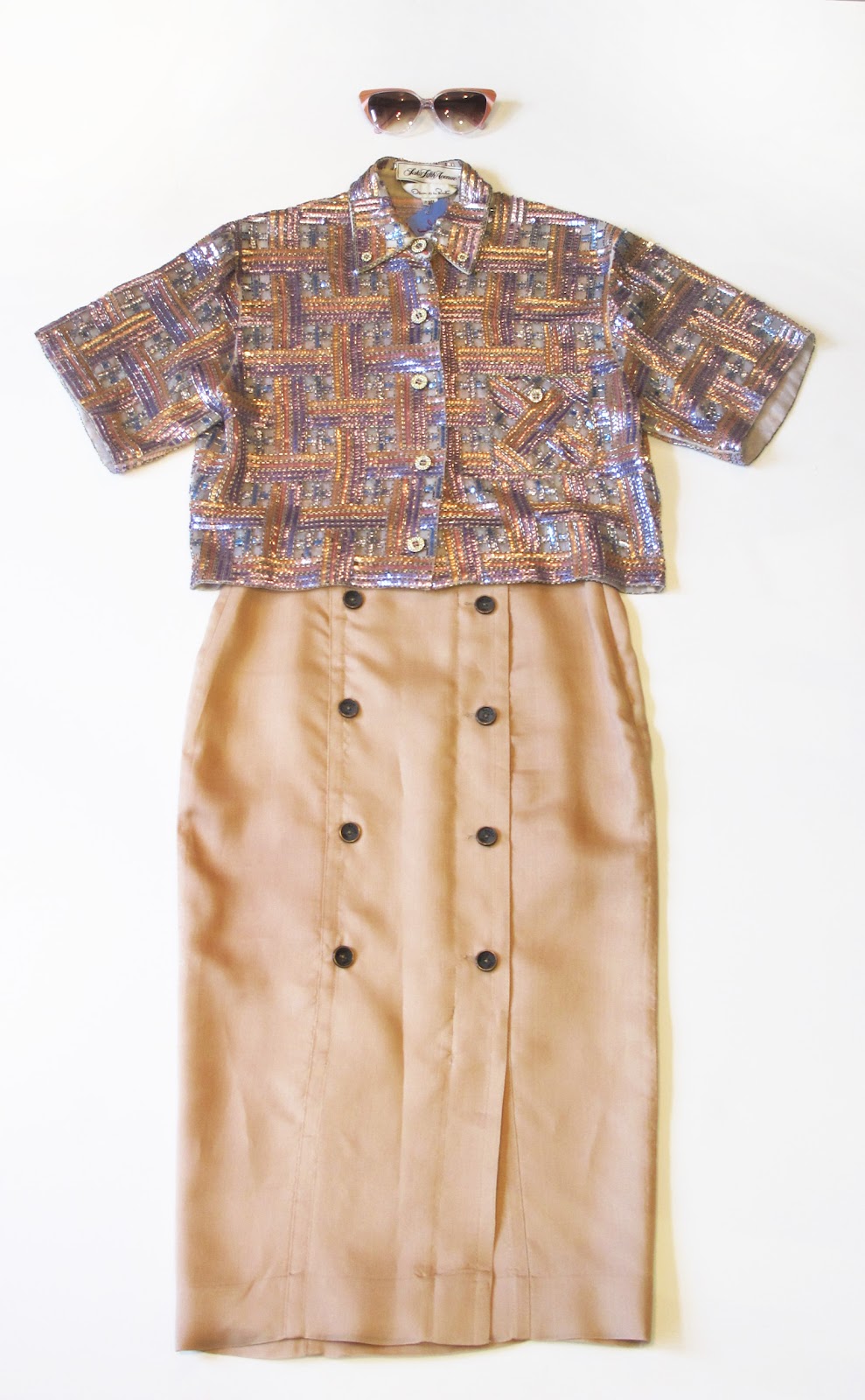 This shimmery 1970's Oscar de la Renta top is highlighted with a tan Bally skirt and a pair of Selima Catherine shades.